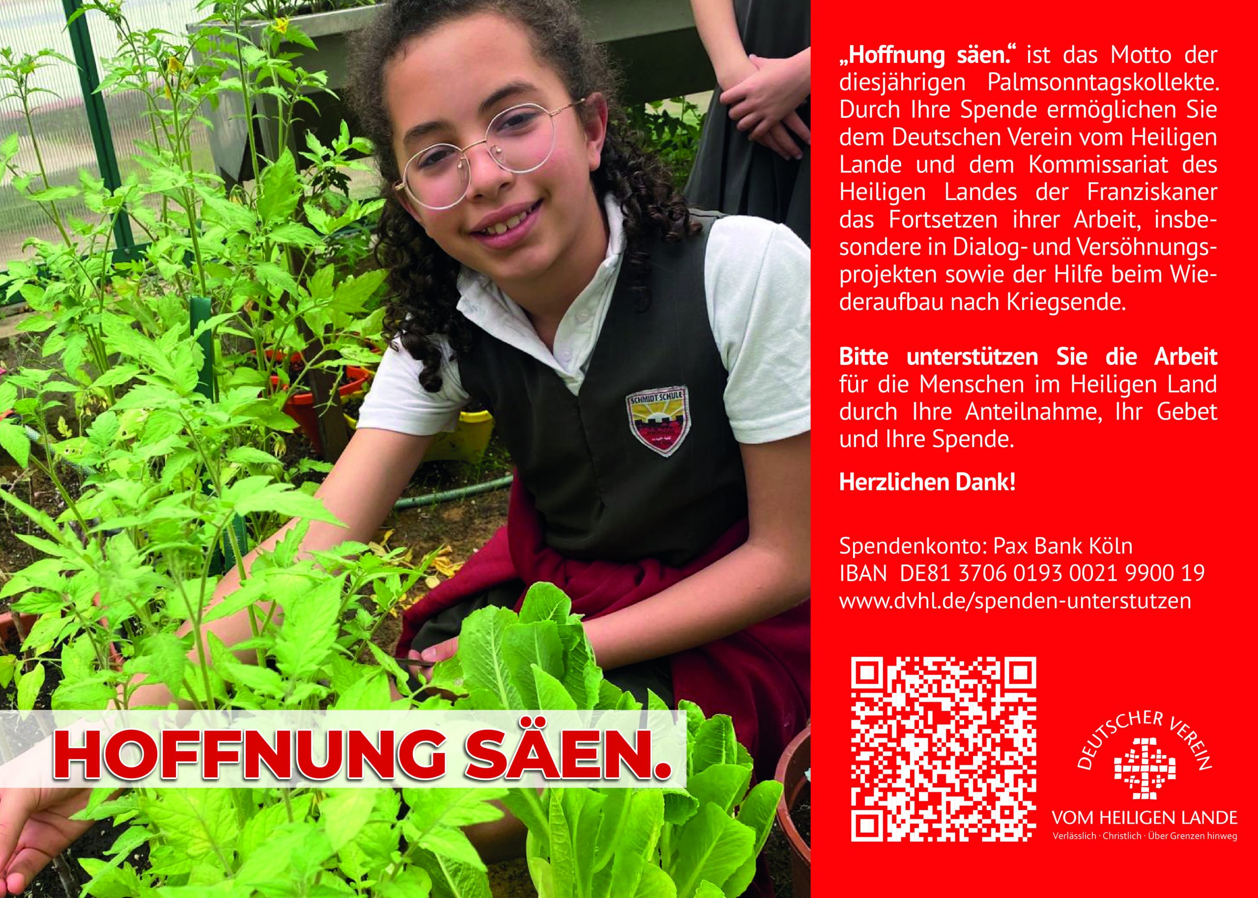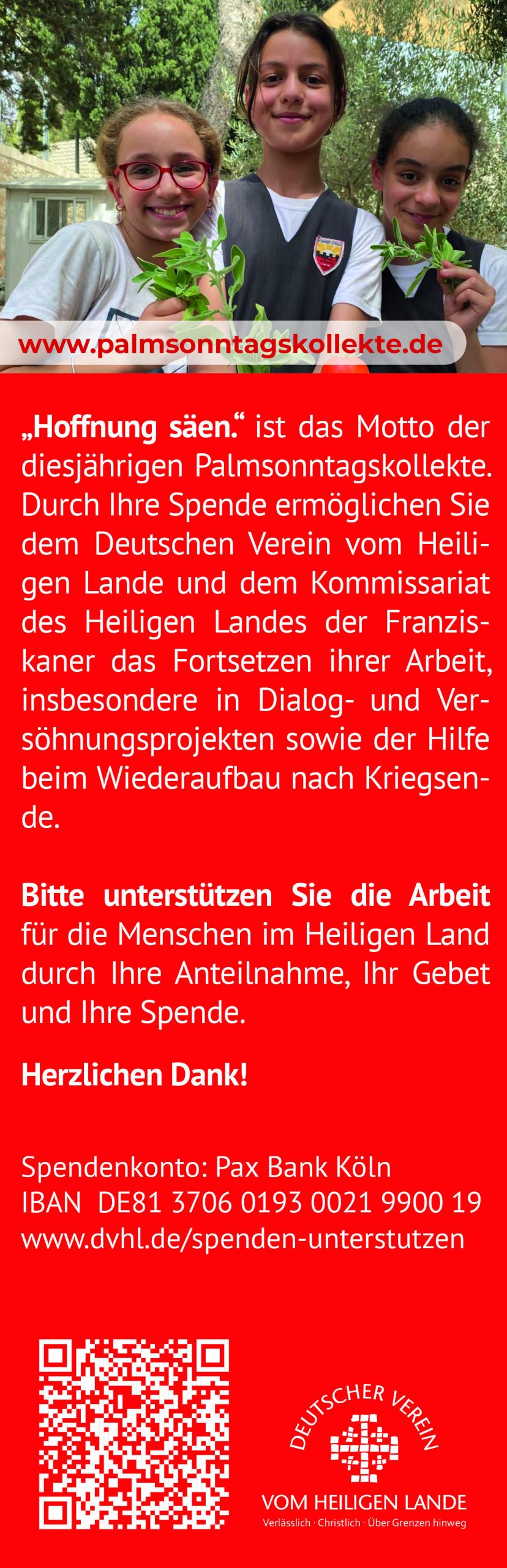 Ihr Gebet und die Palmsonntagskollekte sind für das christliche Engagement in der Region unverzichtbar. Wir freuen uns, wenn Sie bei Ihrer Ankündigung auf unsere besondere Verantwortung und auf die Faszination des Heiligen Landes hinweisen.